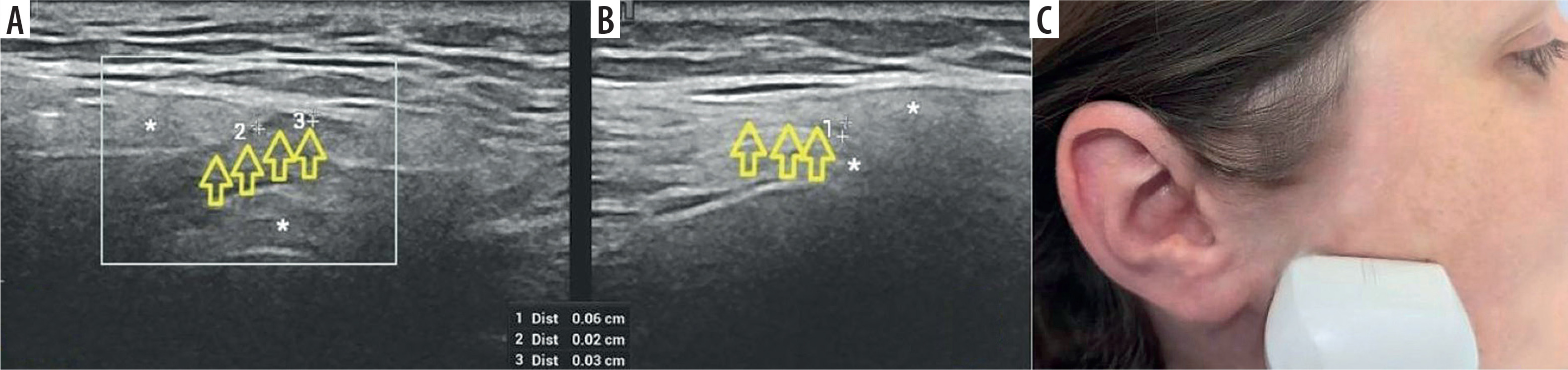 High-resolution ultrasound (HRUS) image of the facial nerve – marked with arrows within the parotid gland. Asymptomatic side (A) in comparison with thickening and blurring of echogenicity on the affected side (B) in 73-year-old patient with facial nerve palsy due to neuroborreliosis. Probe placement is at a height of approximately one-half of the ramus of the mandible, above the parotid gland (C). Images obtained by author with a 5-20 MHz linear probe of the Mindray Resona I9