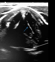 The Doppler signal can also inform us about the normal mobility of VF, as a symmetrical ‘shimmering artefact’ over both VFs seen as coloured dots. The absence of this artefact indicates VF palsy [12]. Another parameter that may be included in TLUS is arytenoids symmetry. Although it has not yet been proved by ultrasound study, a similar investigation was performed on 67 patients who underwent computed tomography of the neck. Images were assessed for discrepancy in arytenoid vertical height and compared to a group with known unilateral vocal cord palsy. The results demonstrated that no arytenoid vertical height discrepancy was seen in 44 healthy individuals. All those patients had a discrepancy of less than 2 mm, while those with vocal cord palsy had a mean value of 2.39 mm. The authors suggested that the vertical height discrepancy represents a pathological process [22].