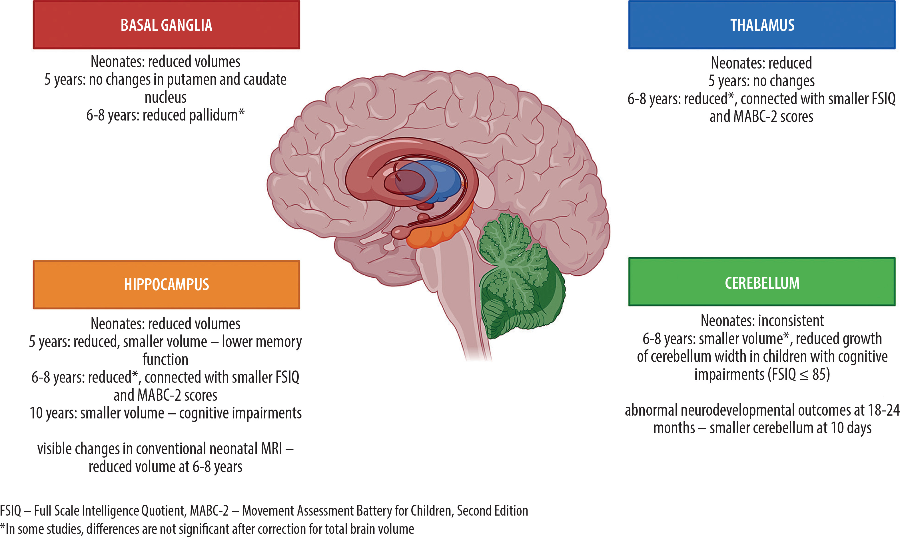Spencer et al. [10] observed significantly smaller thalamic volumes (p = 0.013) at around 7 years of age; however, this difference was no longer significant after correction for TBV (p > 0.05). Correlations were found between thalamic volume and FSIQ (r = 0.452, p = 0.016) and MABC-2 total scores (r = 0.505, p = 0.006). Moreover, patients with cortical injury on neonatal MRI exhibited significantly reduced thalamic volumes (p = 0.002); however, after false discovery rate correction, this association was no longer significant.